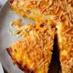 Bedek de bodem van de taart met 200 gram geraspte kaas. Stort daar bovenop de zoete aardappel en verdeel gelijkmatig.