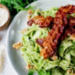 Mix de tagliatelle met de pesto en serveer met een paar repen spek, extra walnoten (grof gehakt) en een beetje rucola.