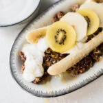 • Verdeel wat granola tussen de banaanhelften in. Giet er een paar eetlepels kokosyoghurt overheen en verdeel het fruit erover. Maak af met de kokosrasp en een beetje honing.