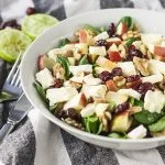 Doe de veldsla in een grote schaal en snijd de appel en brie in stukjes. Verdeel deze over de veldsla.