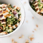 Snijd de halloumi in dunne plakken en grill de plakken onder een grill of in een grillpan. Snijd ze daarna in kleine reepjes en leg apart.