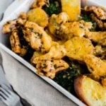 Bak totdat de kip gaar is en doe de kip samen met de broccoli en stukken aardappel in een ovenschaal. Rasp de cheddar erover, zoveel als je wil. Zet voor een paar minuten in de oven, dit is alleen om de kaas te laten smelten.
