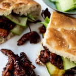 Als de kip klaar is vul je de broodjes met een beetje sla, wat kip en wat komkommer. Eet smakelijk!