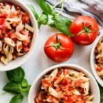 Wanneer de penne gaar is giet je deze af en meng je de blokjes tomaat, basilicum, knoflook en olijfolie's erdoor. Maak af met een beetje peper en zout.