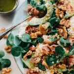 Verdeel vervolgens de plakken avocado over de borden, en doe hetzelfde met de cottage cheese en stukken bacon. Maak het af met een beetje peper en zout, en de grof gehakte walnoten.