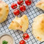 Als je een empanadas knijper hebt: haal het velletje papier van het deeg af en leg 1 plak deeg op de knijper. Vul het midden ervan met een plak mozzarella en daarop 3 á 4 partjes tomaat. Bestrijk daarna royaal met het basilicum mengsel.
