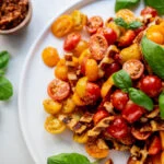 Halveer alle cherrytomaatjes en doe ze in een grote schaal. Roer er 1 eetlepel van de pesto doorheen, de reepjes gegrilde halloumi, een beetje olijfolie, peper en zout en maak af met wat blaadjes verse basilicum. Serveer met de overige pesto in een bakje.