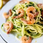 Serveer de courgettie met de garnalen erop en nog wat van de knoflookboter. Maak af met een beetje peper, zout en citroenrasp.