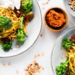 Bak nu de courgetti heel kort in een koekenpan en meng ondertussen 3 el van de pesto erdoor. Serveer de courgetti met de bimi en een dot ricotta. Maak af met pijnboompitjes en zongedroogde tomaatjes.