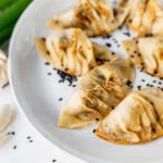 Leg op de onderste helft van het deeg een kleine eetlepel van de vulling en smeer de rand in met een beetje water. Vouw het vel dubbel en maak vouwtjes terwijl je de dumpling dichtknijpt. Druk de rand goed aan.
