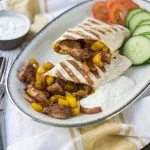 Pak nu een durum, beleg deze in het midden met een strook kipmengsel, vouw de zijkantjes naar binnen en rol daarna op. Grill nog even op de grill en serveer met de komkommer, tomaten en tzatziki.