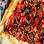 Als de randen mooi gekleurd zijn is de taart goed. Verdeel als laatst de pecannoten en wat honing over de taart. Snijd met een pizzasnijder in stukken.