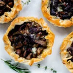 Verdeel de gekaramelliseerde parten ui en de paddenstoelen over de vier taartvormpjes en brokkel de gorgonzola erover. Vouw nu de randen filodeeg terug. Bestrijk het filodeeg met het losgeklopte ei en schuif ze in de oven voor 15 minuten.