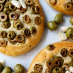 Bestrijk de focaccia's met de olie uit het bakje olijven en verdeel daarna de olijven erover.