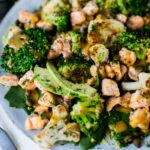 Maak nu de schaal op door de spinazie over de schaal te verdelen. Verdeel daarover ook de roosjes en de zalm. Daarna de plakken avocado, kappertjes en dille.