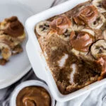 Duw nu de overige schijfjes banaan in de havermout. Lepel wat dotjes karamel op de havermout en banaan en schuif de ovenschaal in de oven voor ongeveer 25-30 minuten. Klaar wanneer de bovenkant een donkerder kleurtje krijgt.