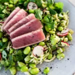 Maak nu de salade op met de wasabi-courgette, rucola, veldsla, radijsjes en sojabonen. Verdeel de plakken tonijn erover en maak af met een beetje citroensap en zwarte sesam.
