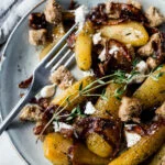Verhit de roomboter met de honing in een koekenpan, roer even door en voeg vervolgens de halve ringen ui toe. Voeg daarna ook de peren en de fijngehakte tijm toe. Bak op middelhoog vuur totdat de peren zacht zijn en een mooi bruin kleurtje hebben.