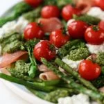 Als alles klaar is verdeel je de aspergepunten en aspergebroccoli over een schaal. Verdeel de mozzarella en parmaham erover en als laatste de trostomaatjes.