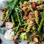 Giet de pasta af en meng de pasta met de gebakken doperwten, groene aspergepunten en broccoli. Voeg ook de geraspte courgette (rauw) toe.
