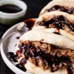 Als het vlees gaar is trek je het met twee vorken uit elkaar. Snijd de bao's open en beleg ze met het vlees en de barbecue saus. Serveer met een salade of wat schijfjes komkommer.