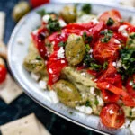 Verdeel de hummus over een schaal en maak af met de geroosterde groenten, olijven, brokken feta en fijngehakte kruiden. Serveer met picos.
