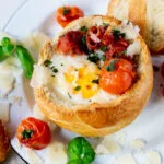 Breek nu de eitjes boven de Italiaanse bollen en zet ze in de oven 10-12 minuten. Het ei moet gestold zijn.