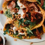 Wanneer de drie omeletwraps klaar zijn beleg je ze met een laag pesto, wat rucola, zongedroogde tomaatjes, een paar plakken buffelmozzarella, een paar plakken parmaham en wat van de overgebleven pijnboompitjes.