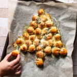 Leg op ieder plakje pizzadeeg een stukje mozzarella. Vouw het deeg over de kaas en rol het tot een bolletje. Leg de bolletjes deeg in de vorm van een kerstboom op de bakplaat.