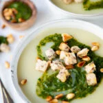 Pureer het geheel met een staafmixer tot een egale aardappelsoep.