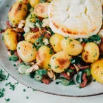 Hussel de krieltjes met de bacon, lente-ui, walnoten en verse bieslook.