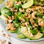 Wanneer de garnalen gaar zijn meng je ze met de verse kruiden. Roer goed door en verdeel over de salade. Maak af met een beetje peper en zout.