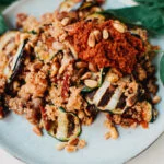 Mediterraanse Quinoa Salade met Gegrilde Groenten, Kippendijen en Rode Pesto