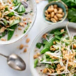 Voeg op het laatst de noodles toe en serveer de soep met bovenop een beetje taugé, Spaanse peper, koriander en ongezouten pinda's.