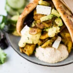 Begin nu met het beleggen van de naanbroden: smeer de hummus erop, verdeel er wat plakjes komkommer en rucolamelange over en verdeel daarna de kip over de naanbroden.