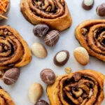 Verdeel het suikermengsel over het deeg en rol het deeg vanaf de korte kant op. Snijd er dikke plakken van en leg deze op een met bakpapier bekleed rooster. Duw ze een beetje in vorm en schuif in de oven voor 12-15 minuten.