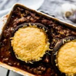 Wanneer de saus op smaak is giet je deze in een ovenschaal. Druk vervolgens de twee portobello's met de bolle kant erin en vul deze met de geraspte kaas. Laat de kaas in 10 minuten smelten.