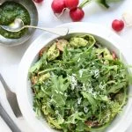 Schep wat van de pasta op een bord, daaroverheen wat van de pesto en bovenop leg je wat rucola. Maak af met nog een beetje geraspte Parmigiano Reggiano.