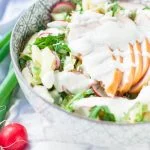 Verdeel de kip over de salade en giet als laatste de dressing erover. Maak af met een beetje peper en zout.