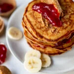 Wanneer de pancakes klaar zijn bouw je het taartje op; smeer de eerste pancake in met een beetje pindakaas en leg daarop de volgende pancake. Smeer deze in met jam en herhaal dit proces zo nog een aantal keer totdat de pancakes op zijn.