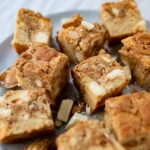 Ik heb voor deze blondies een ovenschaal van 14x24cm gebruikt. Als je de randen van de cake afsnijdt, dan hou je 12x20cm over en daar kun je 15 blondies van 4x4cm van snijden.