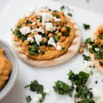 Voeg nu alles samen; smeer een beetje hummus op de pita's, verdeel de boerenkool erover, verdeel de kikkererwten en verkruimel als laatst wat feta over iedere pita pizza.