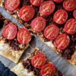 Smeer de mascarpone over de vellen bladerdeeg heen, laat een rand van 1cm over aan de zijkanten (met 6 vellen bladerdeeg heb je iets meer mascarpone, gehakt en cherrytomaatjes nodig).