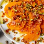 Breek de pancetta in kleine stukjes en verdeel deze over de pompoen. Hak de geroosterde pistachenootjes grof en verdeel deze samen met de Spaanse peper ook over de pompoen.
