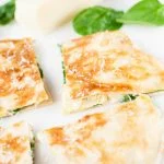Snijd de quesadilla in 4 punten en bestrooi met nog wat Pecorino.