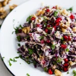 Meng de rode kool met de geraspte courgette en brokkel daar de feta overheen. Voeg de fijngehakte munt en walnoten toe en roer het geheel goed door elkaar.