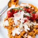 Serveer de risotto met de trostomaatjes en wat schaafsel kaas.
