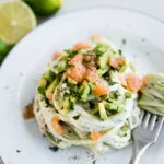 Roer ook de avocadoblokjes, de gerookte zalm en de fijngehakte basilicum voorzichtig door de romige courgetti.