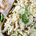 Mix de gekookte pasta met alle overige ingrediënten en de dressing. Maak af met een beetje verse dille.