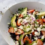 Brokkel de witte kaas en verdeel samen met de plakjes aardbeien en blokjes avocado over de salade.